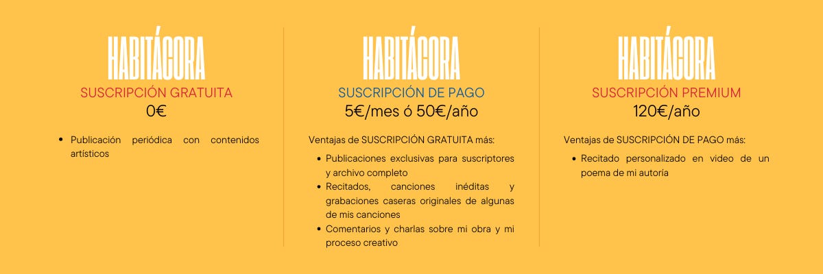 La suscripción de pago (por lo que cuesta una cerveza y un café en Madrid) es para quienes quieren conocer un poco más en profundidad mi actividad artística desde dentro.
